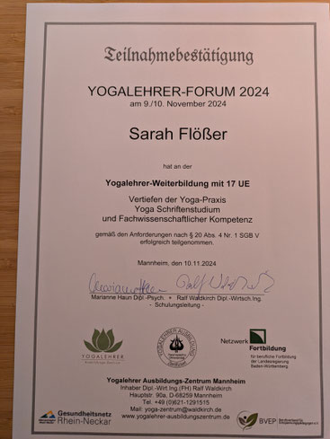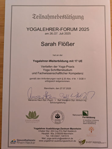 Heute habe ich die Krankenkassenanerkennung als Kursleiterin für Hatha-Yoga-Kurse erhalten.